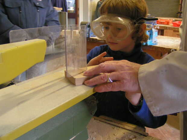 Por lo tanto, estirar la Sierra de calar. Gafas de nuevo, asegúrese de que el protector se coloca para permitir que la base a través sin el dedo y que abuelo sostenga la base firmemente mientras guía a través de.
