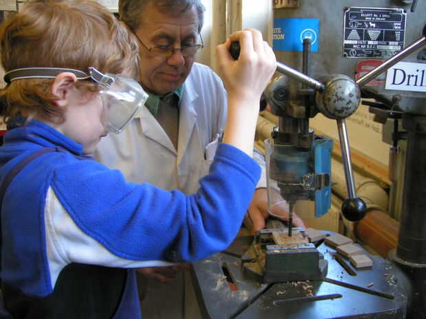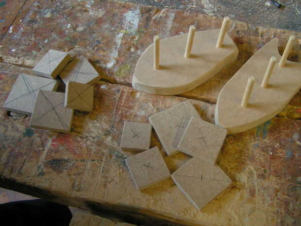 Los muchachos tenían los centros, agujeros fraccionario más grande que el diámetro de los postes, suavizar los bordes y esquinas, y eliminar sus marcas de lápiz, con papel de vidrio.