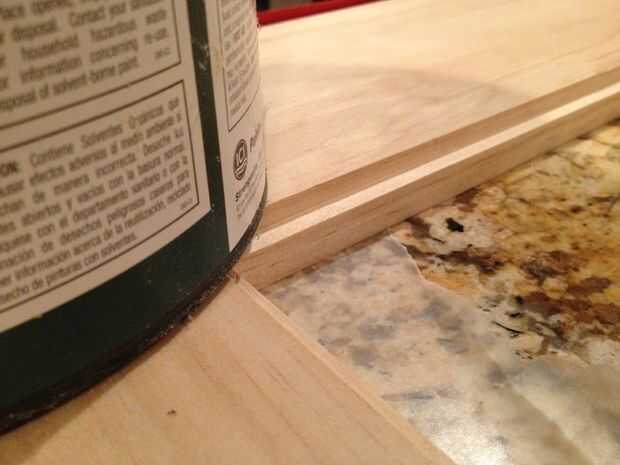 Prueba de ajuste de las piezas boca abajo en el piso y colocaron las piernas en el lugar para verificar el espaciamiento. Me centré las piernas a lo largo de los ingletes uniformemente. Entonces medí ese espacio para determinar la longitud de la falda. Cortan las placas restantes de 1 "x 6" para hacer las piezas de la falda y dejar de lado. Tomé la pieza superior dentro de a más nivel más lugar en mi casa, nuestra isla de cocina. Coloqué las mejores piezas en el mostrador, funcionó pegamento en los ingletes y utiliza una pinza de la correa para reunir las piezas. Artículos planos tienden a inclinarse cuando atado por lo que coloca una lata de pintura pesada en cada esquina mientras seca. Para mantener a mi esposa feliz y ella no me mata, coloqué un pequeño trozo de papel de cera debajo de cada área que se pega para que no escape en la encimera.