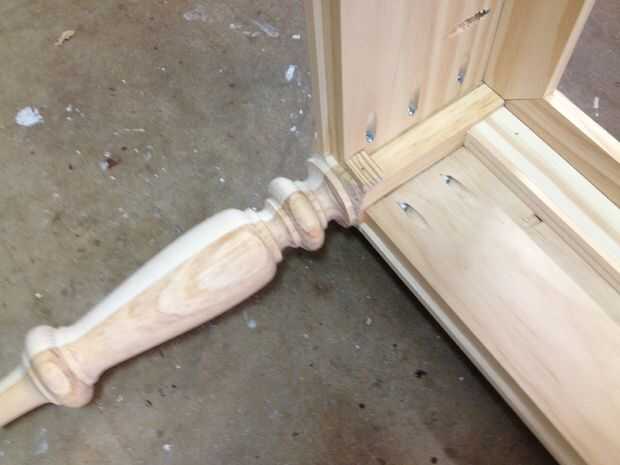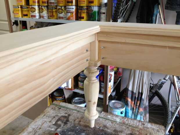 Una vez todo seco durante la noche, comencé agregando elementos decorativos en los bordes de la falda. Añade caracteres a la tabla pero también escondía el borde de la parte inferior de la madera contrachapada pondría yo más adelante. La pieza superior corte y colocado en la parte superior entre las piernas. La otra pieza que puse a lo largo del borde inferior de la falda de longitud aprox. de ¼". Engañé sosteniendo un pedazo de chatarra de ¼" en el borde mientras que pegado y la clavó. Ninguna medición. Repita en los 4 lados. Luego pegado y había clavado una 1 "x 2" en el interior de la falda en la parte superior. Agrega más estabilidad a la parte superior y ayudó a ocultar los tornillos de bolsillo. He puesto ¾ "x ½" pino en las esquinas de las patas. Esto sería ocultar el borde de la madera inferior cuando se instala para un aspecto más acabado.
