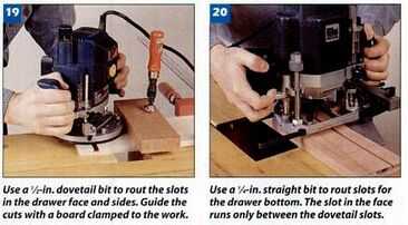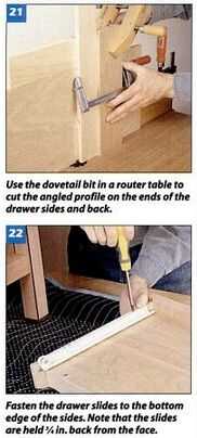 Recuerde que la ranura en el frente de la gaveta se extiende sólo entre las ranuras de cola de Milano. Instale la punta de la cola de Milano en una mesa de fresadora y usarlo para cortar las juntas en los extremos de los lados del cajón y la espalda (Foto 21). Fijar una copia de seguridad tira guía y Consejo a la pieza de trabajo al fresar para evitar que la madera de partir al final del corte. Recorte la pequeña muesca en el borde delantero de los lados del cajón con una sierra de cola de Milano.