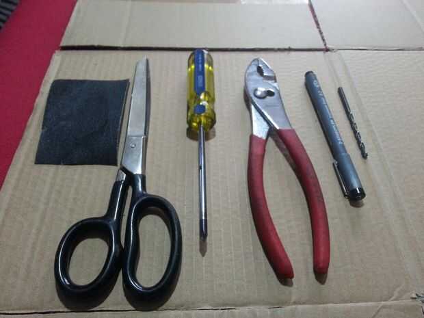 Esta es la lista: tijeras, alicates, destornillador, lápiz, marcador, broca y taladro (no en foto).