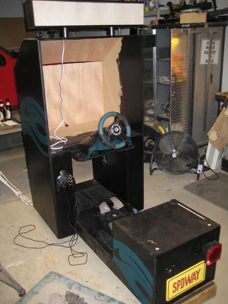 Perfore un agujero lo suficientemente grande como para adaptarse a los cables de alimentación y cables de AV a través de la mitad posterior de la base de la tv. También Perfore un agujero donde el espaciador del recuadro izquierdo toca la caja superior del panel y marquesina. (ver fotos) Esto se utilizará para la parte posterior iluminación cable de alimentación. Por último, haga un agujero a través del lado izquierdo del volante, base para adaptarse a los cables del controlador.