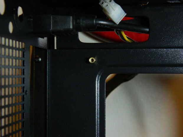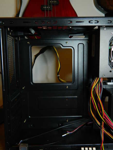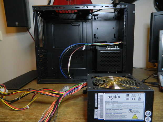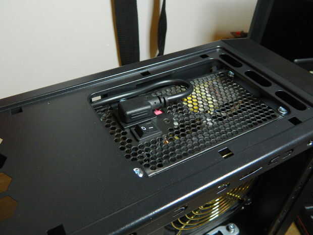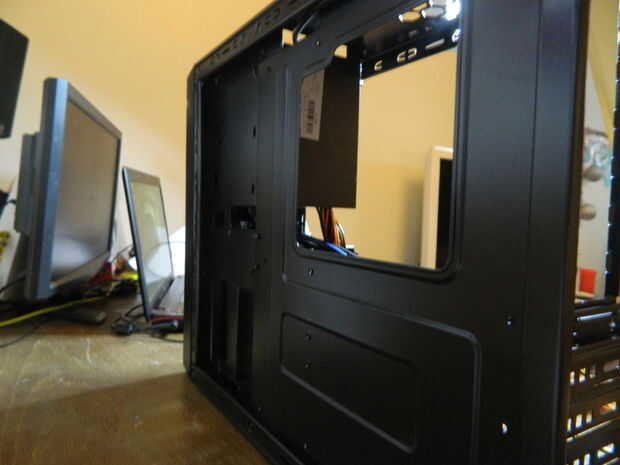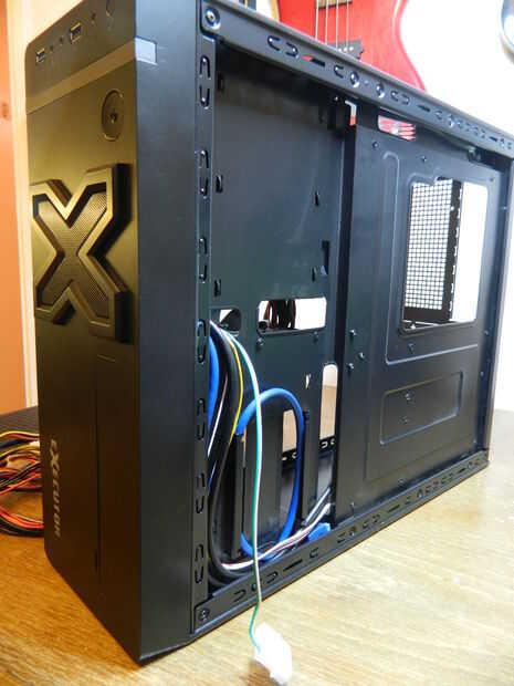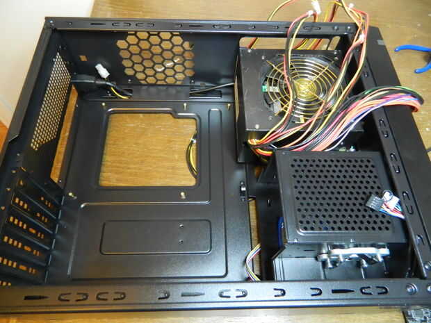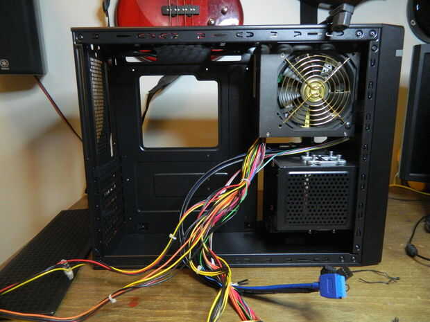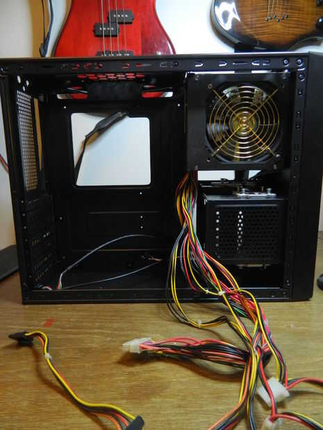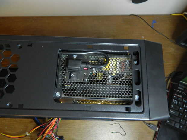 Empuje los cables propios de la case´s a la parte trasera de la caja e instale la fuente de alimentación en su propio lugar.