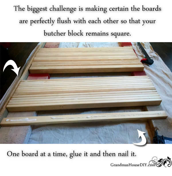 Debido a que mi material es una elección muy extraña para el bloque de carnicero sabía que esto sería una encimera de bloque de carnicero algo "no convencionales". Sin embargo, creo que resultó bien y tuve que cortar nada, acababa de usar la longitud de las placas que tenía en mano. (Por qué mi abuelo tenía literalmente una plataforma digno de estas pequeñas tablas de pino en el granero no tengo ni idea, yo estoy zurcido curiosidad si tenía algún tipo de plan para ellos). Una vez que todo estaba clavado y pegado juntos tomé nuestras dos pinzas largas y sujeta tan duro como fuera posible. También tuve que hacer un poco golpeando sobre toda cosa hacerlo más recto como yo no el mejor de los puestos de trabajo en la fabricación de un rectángulo perfecto, sin embargo, el martilleo sobre lo trabajado y todo resultó mejor entonces pensé que sería. Dejó afianzado con abrazadera para más de un día y poner encima de nuestra isla recién terminado (un soporte de radio convertido en una isla de cocina rojo) y había atado con unos clavos del clavito desde la parte inferior. No va en cualquier lugar.