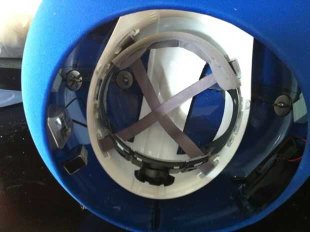 a continuación, cortar secciones de casco a cada lado para permitir la facilidad de acceso a los accesorios del oído una vez instalado el casco. Cascos están hechos de material es muy resistente a la cola, así haga varios agujeros en el casco en la zona donde entra en contacto con el mundo y también áspero el área de lijado. Una vez que has hecho un prueba de ajuste de la cabeza con el casco en su lugar, marque donde el área áreas de contacto en el mundo y asegurar el casco en su lugar con una gran cantidad de pegamento caliente temperatura baja. Asegúrese de que hay suficiente pegamento para supurar a través de los orificios que ha perforado en el casco, creando una unión mecánica entre el acrílico y el casco. Sostenga firmemente en su lugar hasta que el pegamento se haya enfriado por completo.