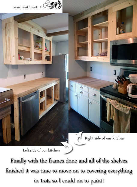 Usted puede ver lo emocionado fueron finalmente tienen algunos gabinetes para poner cosas! Lo que ves en la imagen de arriba me tomaron dos días enteros. Todos los 2x4s están cubiertos en régimen de Pensión 1x4s o grano y están listos para la pintura! Casi todo el mundo en mi vida cuestionaron mi elección para construir nuestros gabinetes de cocina cuando ciertamente pude encontrar gabinetes decentes utilizados que podría modificar para trabajar. Normalmente habría inclinado así (todos sabemos que soy un pintor y no un constructor!) pero totalmente esperaba que intentando conseguir premade gabinetes para trabajar en nuestras paredes muy torcidas y en nuestra cocina específica hubiera sido mucho más problemas y nos simplemente no podríamos permitir que alguien construya gabinetes para nosotros. Encima de todo eso, tuve mi corazón sobre el uso de tres viejas ventanas para puertas de armarios. En mi mente no había ninguna opción y fue lo que tuve mi terquedad en y Señor ayudar a cualquier persona que intente detenerme cuando eso sucede.