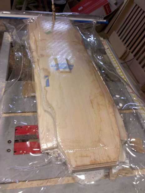 Todos los plys pueden pegarse a la vez. Lamentablemente no estoy optimista y prefieren añadir una hoja a la vez, esto también permite para sujetar más fuerte y más uniforme. Liberalmente aplique el pegamento en la primera capa y poner la siguiente encima (yo uso tite bond sin problemas, por supuesto pueden utilizar pegamentos laminados más caros). Alineando estos plys en el molde, selle la bolsa y empezar a succionar el aire hacia fuera. Asegurar las plys no se resbalen y la mala Nota chupar bajo la plys.