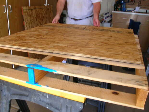 Ahora que tienes dos trozos de conglomerado de tamaño para que coincida con la parte superior de la plataforma, coloque ambos encima de la plataforma. Cuadrados a la plataforma para que todos los bordes queden al ras.