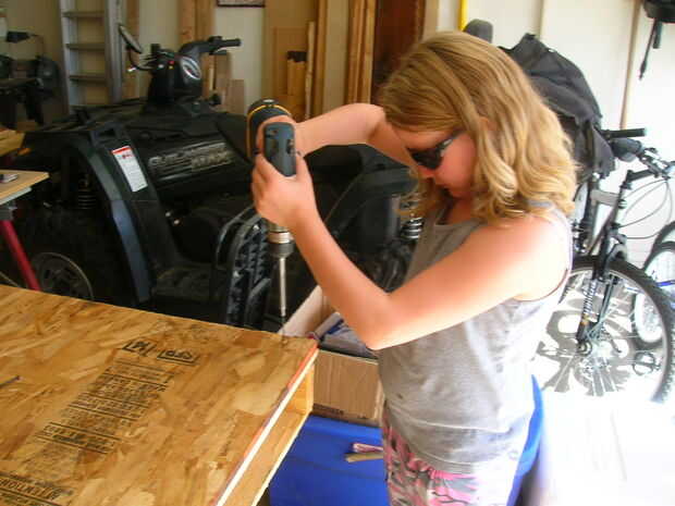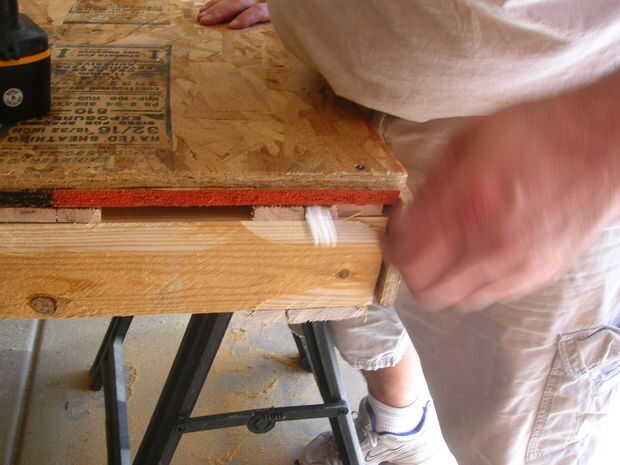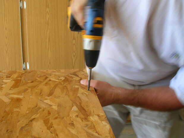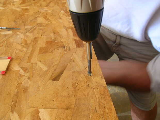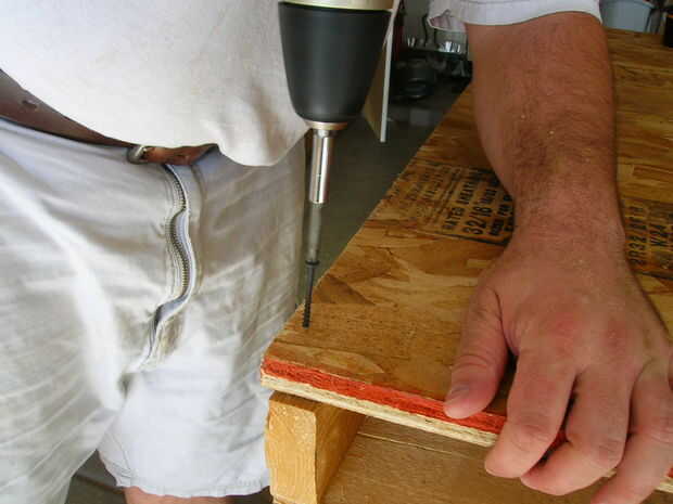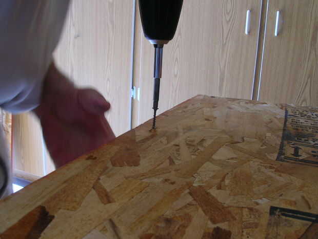 A continuación, usando el taladro / tornillo coche arma su a través del agujero piloto a través de ambas capas de conglomerado y en la plataforma.