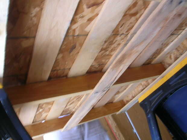 Ahora siga el mismo procedimiento para cada una de las tres costillas en la plataforma. Puse un tornillo a través de cada uno de los tablones de la cruzados y el centro de la plataforma así.