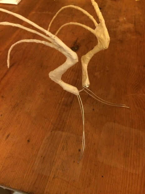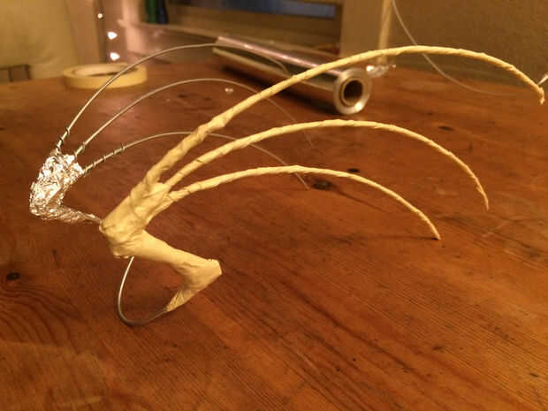 Ahora puede empezar a construir la carne con papel y cinta. Simplemente envuelve los dedos con cinta adhesiva (no papel) para mantenerlos delgados. Antes de que envuelva "bíceps", se unen en un par de hebras de alambre fino, que servirá para sujetar las alas al cuerpo.