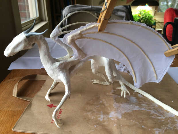 Empape el paño en pegamento blanco, luego cuelgue en los dedos del ala, sosteniendo en su lugar con los pernos de la ropa hasta que se seque. Recorte el exceso con tijeras y forma de los extremos como se desee. Creo que deben tener dragones una lágrima o dos en las alas.