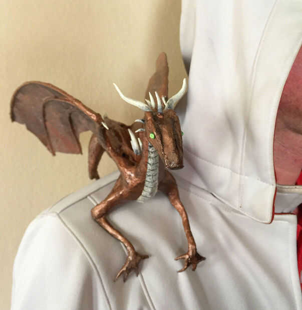 Dio el dragón unas capas de un barniz spray satinado y por último une los ojos con el pegamento. Los ojos son dos diamantes.