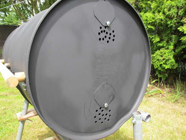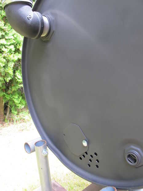 Últimos pasos en la construcción fueron agregar un mango (espiga de madera llana de la ferretería), respiraderos de aire y un medidor de temperatura. También decidió rociar el barril con un pantalón a prueba de calor alta. Además de personalizar un poco el color, la pintura ayuda a evitar la oxidación en el barril. La izquierda lo único que estaba a prueba en una situación de vida real barbacoa.