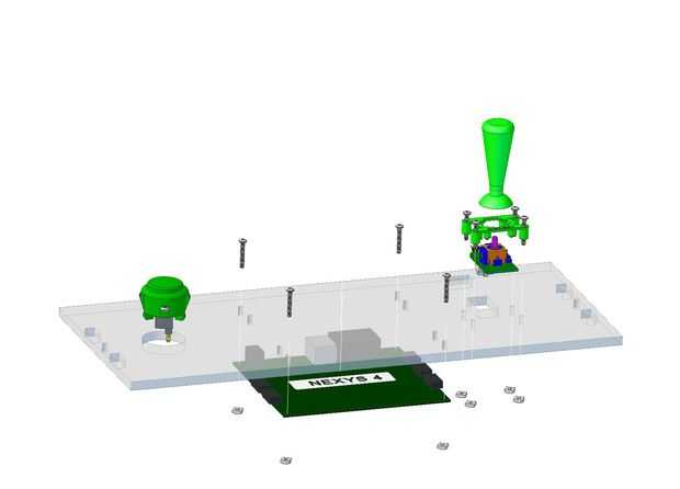 Con el 1" tornillos y tuercas cuadradas, fije el PmodJSTK como se muestra también utilizando el soporte de PmodJSTK.