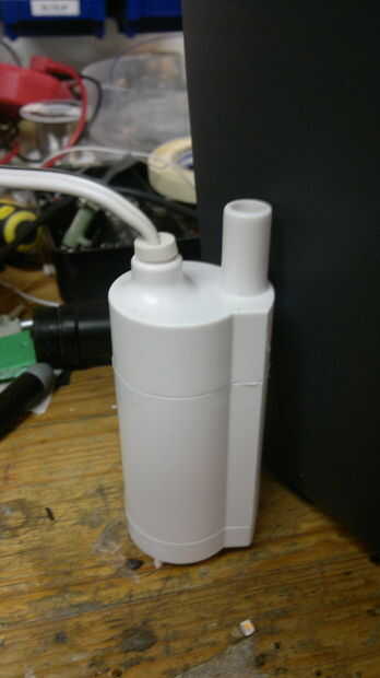 La bomba dentro de la cubeta, muy por debajo de la línea de agua prevista entonces montada. Lo que la bomba está montada sobre es realmente un viejo soporte de herramienta de jardín que yo tenía por ahí. No te olvides de utilizar silicona para hacer los orificios para tornillos estancos...