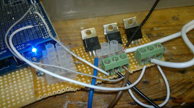Bueno, ya debe tener sus circuitos MOSFET listos (uno para los LEDs) y uno para la bomba, montado sobre el cubo (o como en mi caso, en un perfboard separado). Ahora sólo tiene que conectar los cables de la puerta de tu MOSFET a tus pines de arduino elegido. En mi caso he usado pin 5 y 9. Recuerde que los pernos tienen que ser PWM habilitado! Y luego el cable de tierra de tus circuitos MOSFET para el cable GND de arduino.