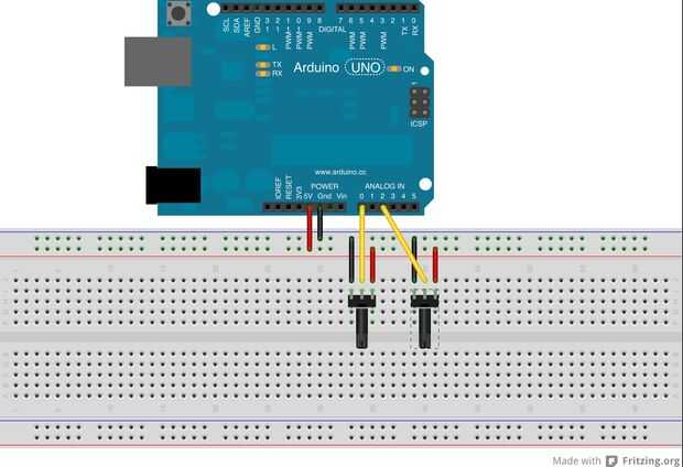 Puesto que el arduino simplemente Lee un valor analógico entre 0 y 1023 de los potenciómetros, no importa cual valor que tienen, he usado dos 10kohm unos. Conecte una pierna a 5v, la media pierna a su pin del arduino y el último tramo a arduino GND.