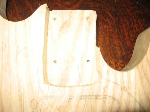 Este siguiente paso incluye enrutamiento, cincelado y perforación. Lo primero que tienes que hacer, es tomar el cuello de la guitarra y trace sobre la parte superior de la guitarra. Ahora, debe tomar el router, configurarlo a la profundidad adecuada y permanecer cerca de la línea. Ahora deben limpiar las esquinas con un cincel afilado y si es necesario cincel el espacio más grande. Ahora debes colocar el cuello en el espacio y marcar donde quieres taladrar los agujeros. Entonces debe tomar la broca de tamaño correcto poco y perfore los agujeros para los tornillos, pero no ir demasiado profundo. La forma más sencilla de instalar el cuello es en jabón, remojo los tornillos para que pasen más fácil.