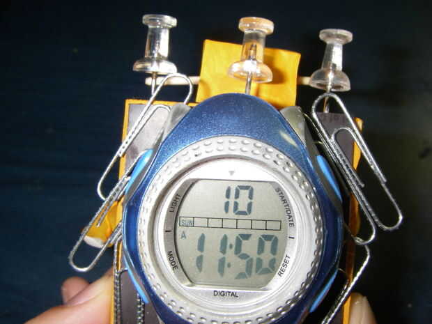 Tiras de imán adhesivo del cuerpo a la parte posterior (el lado que no tiene el agujero para los sacapuntas de lápiz) por lo que cubren. Luego desmontar el reloj por lo que no hay más las correas. Ponga un trozo de velcro en la parte posterior del reloj y otro al centro del imán. Peguen entre sí. Luego pegue los 3 pernos al hombro y asegúrese de que no esté tocando la cabeza.