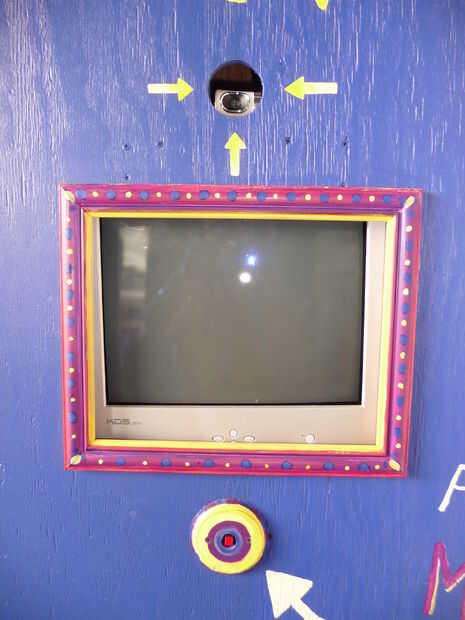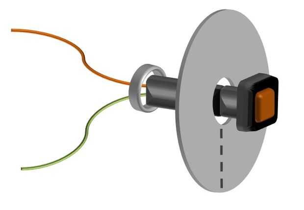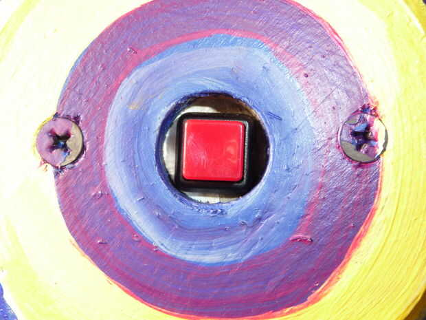 Para fijar el botón de la cabina de la foto hice un disco circular de algún revestimiento lata y cortar el centro y el borde exterior. Esto me permitió deslizar los cables a través del centro del disco lata que sostendría el botón en su lugar. La parte posterior del interruptor de los hilos y viene con una tuerca pequeña para que pueda conectar a una superficie. El disco circular se intercala entre la pared de la photobooth y una placa de cubierta de madera que fue distribuida en un pequeños pedazos circulares de madera. La cubierta de madera se lleva a cabo en lugar por la los dos tornillos que van a través del metal circular del disco así. Para instalar el interruptor que tienes que pasarlo primero a través de la pared y luego coloque el disco metálico sobre los cables.