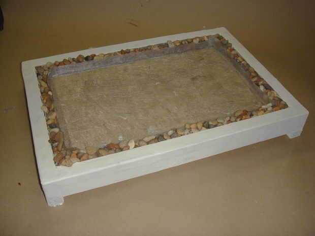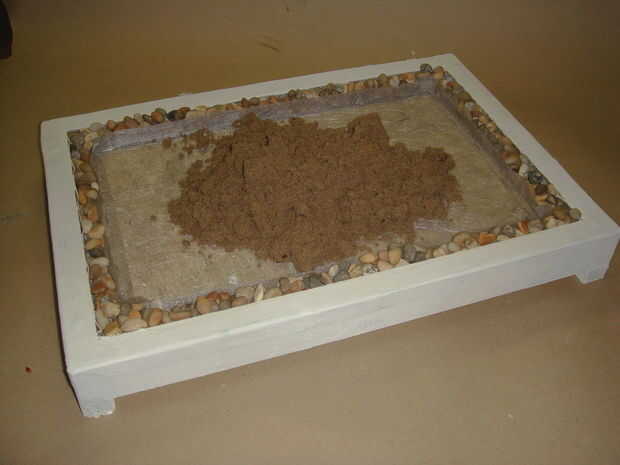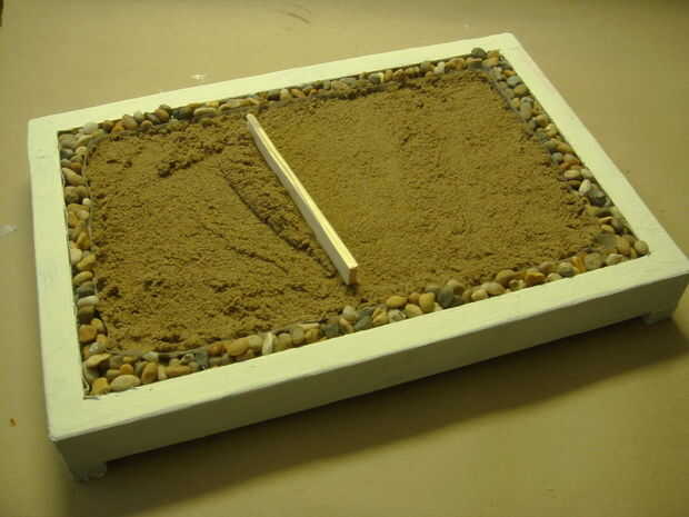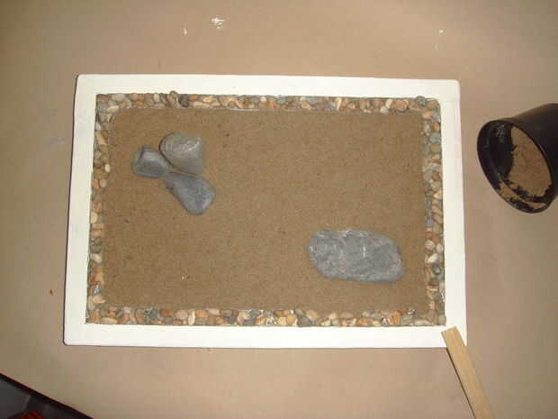 Luego se raspa la arena con la punta de un tornillo o algo afilado de un lado a otro con líneas rectas. Esto le dará a la arena la impresión del agua. También raspar el perímetro de las rocas con las líneas 3-5 que emulan ondas de agua.