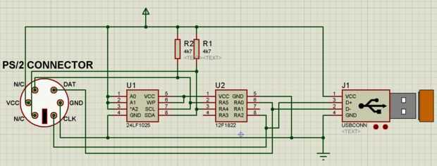 La otra zona está compuesta por el PIC y la EEPROM (y el I2C requiere resistencias pull-up). El PIC tenga cuidado de detectar datos entrantes de PS/2, decodificar y luego la escritura a la EEPROM.