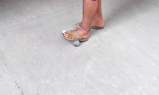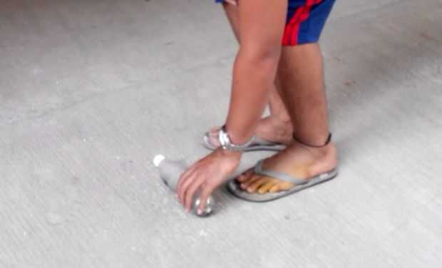 - Ahora, con su izquierda pie, pin de la mitad de la botella al suelo. Coloque su pie derecho sobre el cuello de la botella.