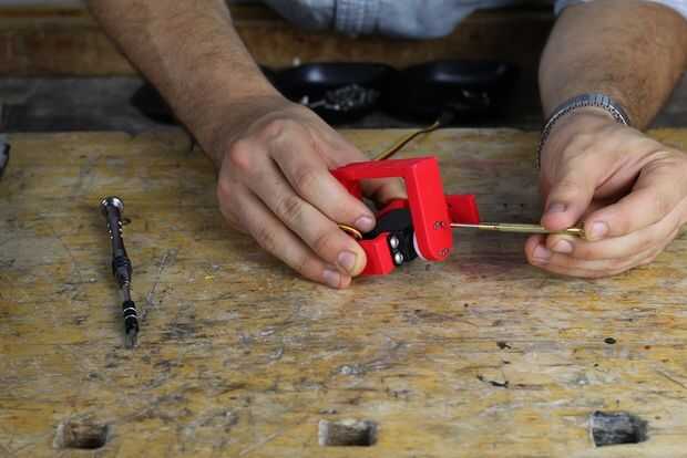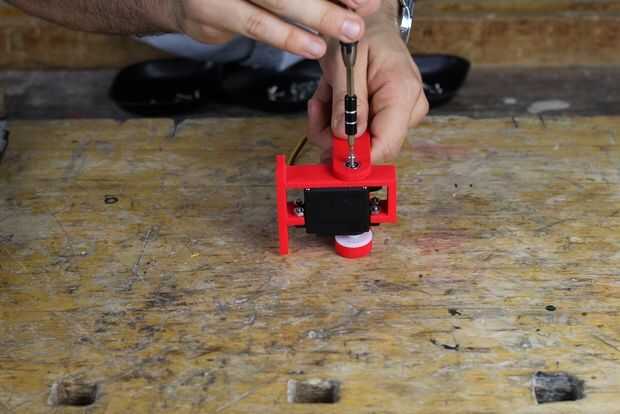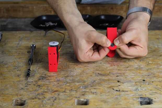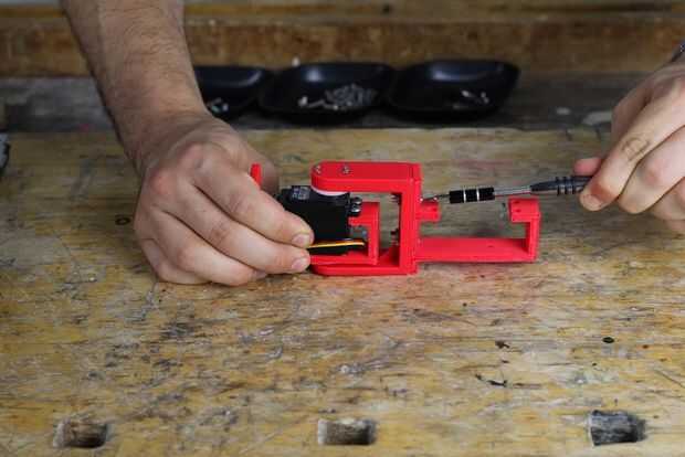 - Tome un M3 x tornillo de 15mm y pasar por el cojinete. Tornillo en el orificio de la parte A hasta casi alcanzar el servo en el otro lado.