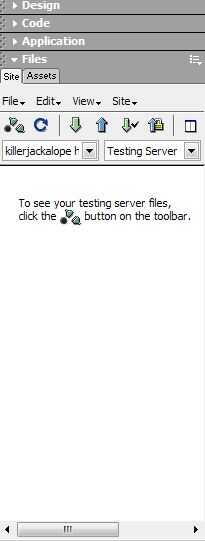Ir a sus sitio archivos y activos de la barra, sin duda se ve muy diferente ahora, haga clic en el menú de vistas poco desplegable y elija servidor de prueba. Ahora dreamweaver ya ha guardado su contraseña FTP. Haga clic en la conexión para botón de host remoto (uno con tres formas divertidas). una vez que dice su comunicado haga clic en el puesto encima de botón de archivos., que es el botón que es un apuntando hacia arriba Flecha. (Para su uso posterior puede iniciar una sesión en la cuenta y utilizar archivos de get para obtener archivos que puede haber perdido en su computadora.)