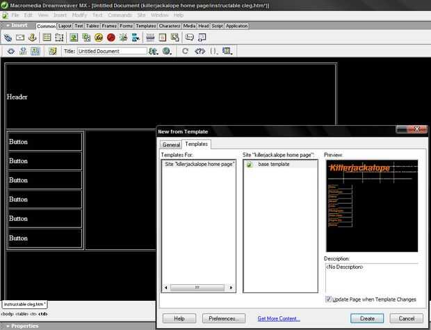 Derecha hemos terminados casi con nuestra plantilla y puede empezar a trabajar en nuestras páginas muy pronto, ya hay regiones editables (lugares para el contenido de la página) agregamos éstos por click derecho y va a la plantilla desplegable en el menú del botón derecho del ratón, elegir nueva región editable y saldrá un mensaje diciendo que el documento se convertirá en una plantilla. Está bueno. Hacerlo con el cursor en las celdas de una tabla donde contenido se va (los bajo y al lado de la barra de menús en la mía)