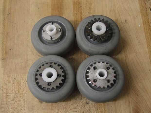 En la vida diaria ejemplos más nondriven las ruedas del echador (e.g. compras carritos, scooters unpowered, equipaje, handtrucks y sillas de oficina) porque es el más fácil de implementar para una rueda que sólo tiene que girar. En aplicaciones industriales con ruedas motrices, cojinetes de ejes sigue siendo la topología dominante.