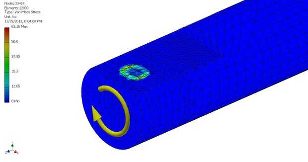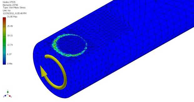 Diseñé una típica cosa redonda con un tornillo de fijación y un eje con el que lo mate. Dos tornillos de ajuste se utilizaron modelos - un tornillo de ajuste pequeño típico encontrado en parte ese tamaño (#6 en un 3/8" parte aburrido) y mucho más grande Tornillo #10 con 50% más de diámetro que a menudo se perfore y pase yo. Se aplicó una carga de lbforce 20 al eje con el componente fijado (que simula conduciendo el eje con un motor) y las resultantes tensiones en la parte visualizada.