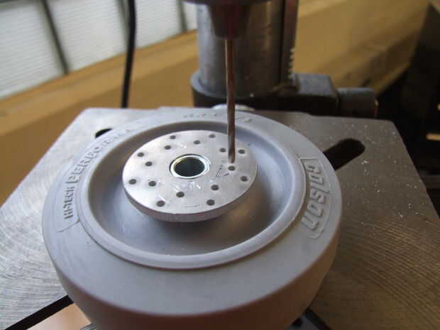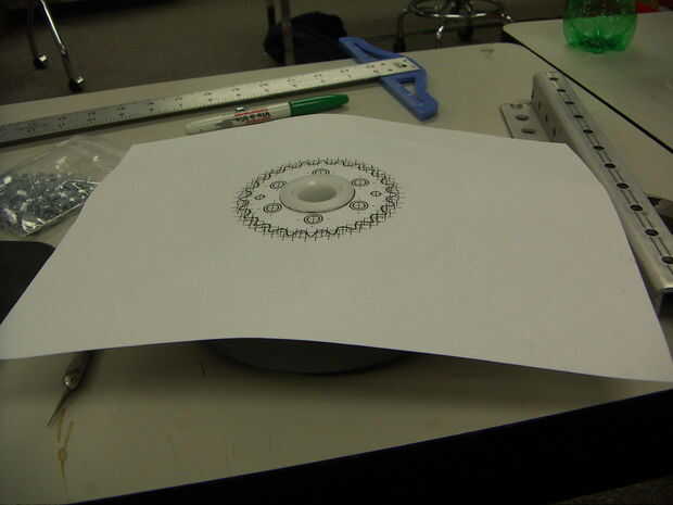 Sí, esto funciona! Creación de 1:1 escala de dibujo de la parte con el patrón de agujero deseado y póngala sobre la parte, usando un jefe circular o eje como una guía de alineación. Centro de todos los lugares necesarios, retire la plantilla y taladro perforar en consecuencia. Asegúrese absolutamente la plantilla impresa escala 1:1, o que eres menos constante entre las partes.