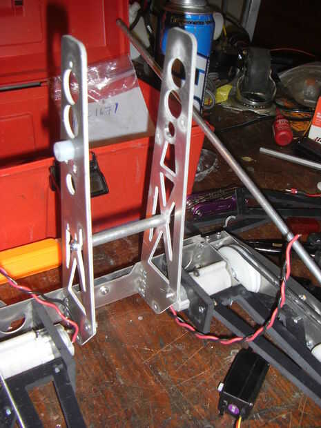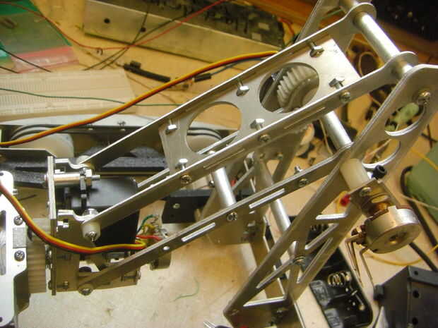 Un gran ejemplo de la utilización de una red intermedia es el brazo manipulador 4-bar del mi propio robot 2.007, se muestra en la imagen 8. Este arreglo fue, por desgracia, solamente de eficacia limitada porque todavía había un gran palmo sin soporte frente al final de grabber, dejándola flex de una manera similar a la imagen 7. Además, descuidado hacer otro de esos platos - dejando el fondo muy poco apoyado. Como resultado, todavía ha movido el brazo significativamente lateralmente bajo cargas aplicadas, pero afortunadamente esto no afectó el funcionamiento del robot mucho.