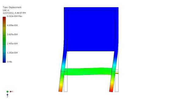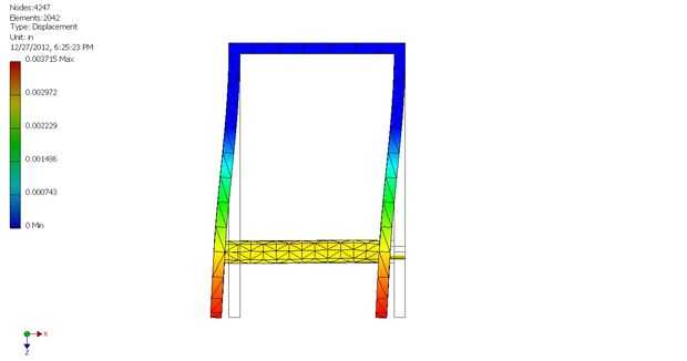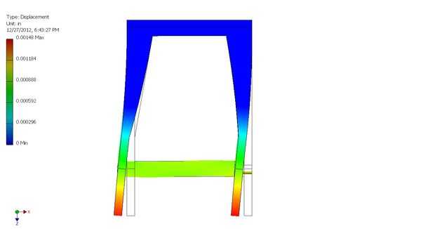 Unidades a un lado, la simulación de elementos finitos muestra la estructura deforme lateralmente con las paredes quedan aproximadamente paralelas. La magnitud de la deformación total es realmente muy baja (0,004" o algo así), pero vamos a ver es la relativa rigidez que cuenta. La forma es exagerada a propósito de la simulación para mostrar la forma final de la Asamblea.