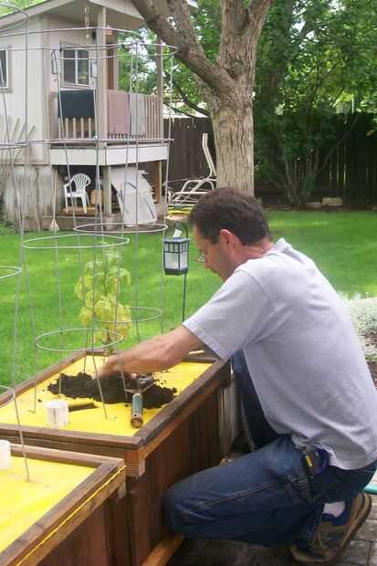 Con el recipiente lleno de mezcla de rellenado correctamente saturado, menor el pajote cubierta por aplanar--muescas alrededor de las patas de la jaula si es necesario--e Instale las piezas de molduras superior de 1 x 2. Estos son previamente perforados con un taladro 3/16 bit y atornillada con 1-1/2" a 2" tornillos. Estas piezas tienen que ser quitadas cada temporada para vaciar y vuelva el recipiente con la mezcla de rellenado fresca (o al menos freshened para arriba!), algo a tener en cuenta. Luego corte Xs grande bastante que se centran en cada jaula. Tuck temporalmente las formas del triángulo debajo y quitar de en medio, suficiente mezcla de rellenado a planta y lejos! (Ray proporciona buena información para este paso).