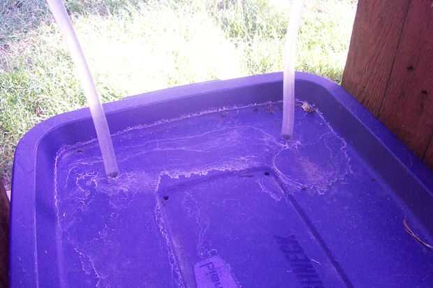 En este punto, el FillTainer tiene un flotador válvula instalada y agua en el FillTainer es 5-1/2" de profundidad. Ahora perfore un agujero de 3/8" a través de la tapa de la bolsa de FillTainer. Verás que el tubo de vinilo transparente es una compresión a través de un agujero de este tamaño. Único problema es la forma de la tapa recoge agua de lluvia, y no puede drenar el agua de lluvia en el FillTainer alrededor del tubo. Mi mano tenía una forma rectangular que era la parte más baja de la tapa, así que perforé un orificio de 1/4" en todos los rincones de esa forma para que el agua no sentarse encima de la tapa. La tapa colores el agua por debajo no crecen algas y mantiene aire desechos y cosas que caen de los árboles fuera del agua.