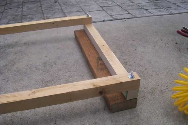 Luego se atornillan las esquinas junto con 3-1/2" los pernos de carruaje (necesita ocho por contenedor más arandelas y tuercas). La única diferencia entre el marco "superior" y el "inferior" es las cabezas de perno de carro están en el marco superior, y las cabezas están abajo en el cuadro inferior. En otras palabras, los extremos de los pernos (donde las arandelas y las tuercas son) apunten hacia la otra.