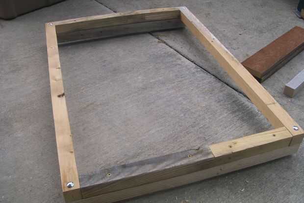 La parte superior e inferior "perímetro Marcos" son idénticos. Cada fotograma se compone de dos piezas largas que son 31-1/2" de largo y dos piezas cortas que son 22-1/2" de largo. Así que cada recipiente requerirá ocho piezas de estructura, cuatro para el marco superior y cuatro para el marco inferior. AMBOS marcos se montan con los pedazos largos superpuestos o sobre los extremos de las piezas cortas. Estas superposiciones se mantienen firmes y cuadrado y luego un 1/4" agujero se perfora hacia abajo a través del centro de la superposición. (Mantener el taladro del pedacito de tierra o concreto o se opacarán muy rápidamente).