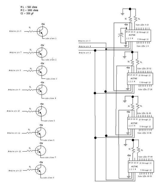 Siga el esquema y construir la placa sin embargo usted elige. Coloqué los chips controladores en el centro del tablero y uso la izquierda para sujetar los transistores que controlan la corriente para cada capa del cubo y utilizan el lado derecho para sujetar los conectores que van desde el controlador de chips a los cátodos de las columnas de LED.