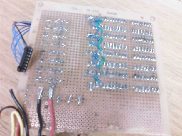 Corté unas 5 pulgadas del extremo de un cable de disquete viejo utilizar el conector para el Arduino. El cable del floppy es 2 filas de 20 pernos, los huesos desnudo Junta tiene 18 pines. Se trata de una forma muy barata (gratis) para conectar el Arduino a la Junta. Me tiró el cable de cinta separados en grupos de 2 hilos, había pelado los extremos y los soldados juntos. Esto le permite conectar el Arduino en cualquier fila del conector. Siga el esquema y soldar el conector en su lugar. No te olvides de la soldadura de los 5 voltios y tierra lleva el conector alimentar el Arduino.