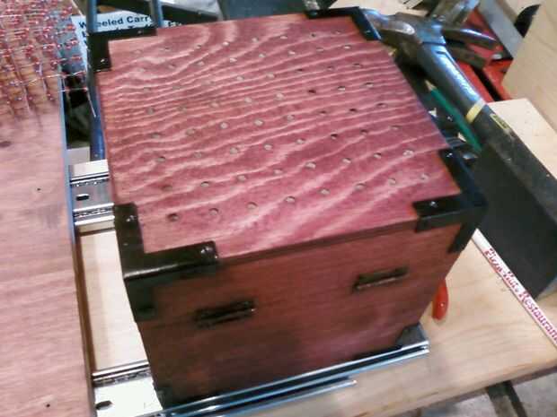 Encontré este cofre de madera en el pasillo de la manía por $4 y pensé que sería perfecto ya que tiene espacio interior para sostener el cable y se ve bien. Manchado esta una mancha roja, mismo que usé en mi escritorio de la computadora para que coincida con.