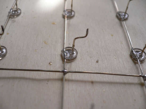 Comentario: 8 casillas del tablero del prototipo serán el anfitrión de un alambre de la capa (catódica) y el alambre de columna (anódica). Después de todo la Plaza de la 64 tabla se han solucionado, soldar todos los cables a los tableros del prototipo y cortar los alambres superior más. De esta manera la conexión con los cables de control va a ser fácil.