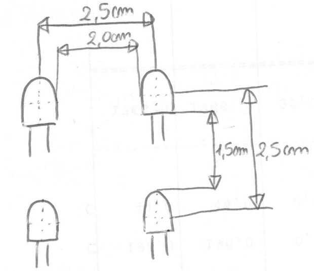 Coloque el led en el tablero de contrachapado, una capa en cada momento. Doble los terminales anódicos (+) como se muestra en la imagen. Doblar los terminales es necesario soldar terminal anódica en la columna con un alambre recto, sin necesidad de alambre para superar el led.