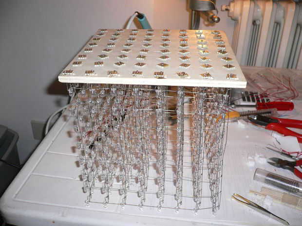 Coloque la capa superior en el tablero de madera contrachapada con los leds correspondientes a los agujeros. Suelda todos los cables previamente preparados 64 a los terminales anódicos de los leds. Al terminar esta capa, inserte desde la parte superior de la capa siguiente y continuar soldando los terminales.