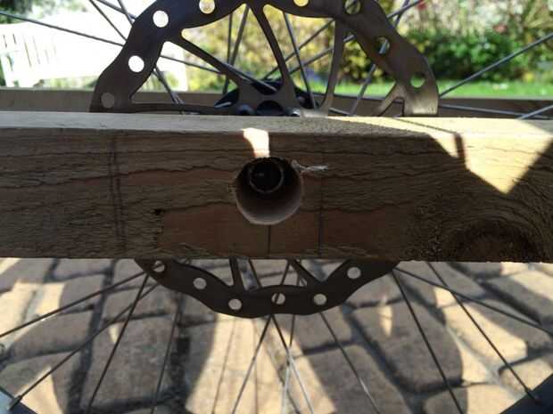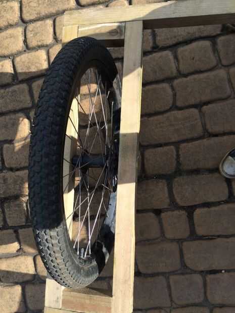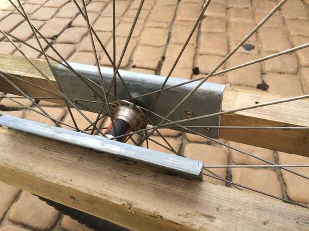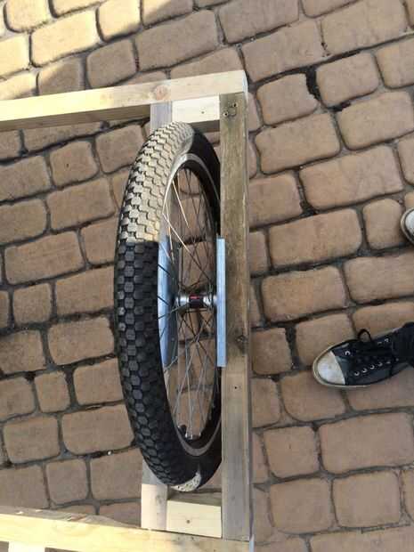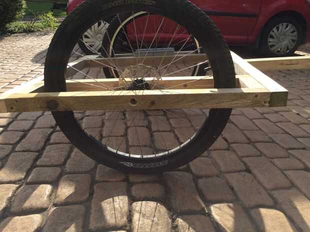 En primer lugar, tenemos que hacer los soportes de dos ruedas, estas escuadras están hechas sólo de 4 piezas de madera cada. Dos son la misma longitud que la anchura de la rueda, los otros dos son la misma longitud y la longitud de la rueda. Conservé los árboles que ya estaban separados de las ruedas. Desafortunadamente los ejes donde diferentes diámetros en uno de ellos de que tenía un soporte por parte metal de hoja, esto consolidó la articulación.