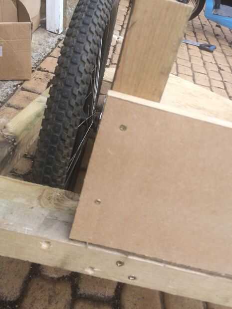 Agregar los lados es muy importante puesto que cosas podrían tocar las ruedas y el bloque provocando un accidente y lesiones. He añadido los lados apretando 4 postes verticales en el interior de las ruedas. Entonces añadí una pieza posterior para mantener la Plaza. He añadido los dos polos frontales así. Esta fue la primera etapa más tarde que añadí más.