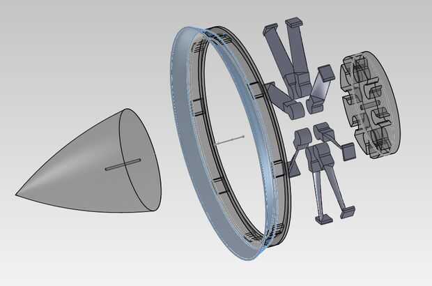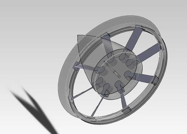 El anillo, como el centro y las hojas, se puede modelar en un programa de CAD como Solidworks. La máquina CNC que teníamos acceso a es demasiado pequeña para la máquina el anillo, por lo que fue producido usando un cortador láser, de acrílico claro de 4mm.